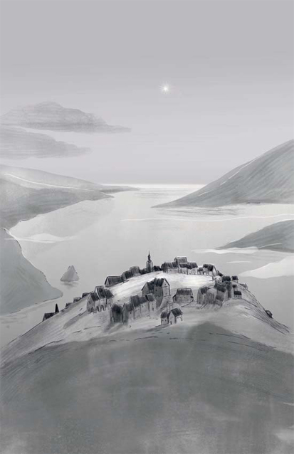 Illustration #03—The village of Morning Song along the shores of the White Sea. |